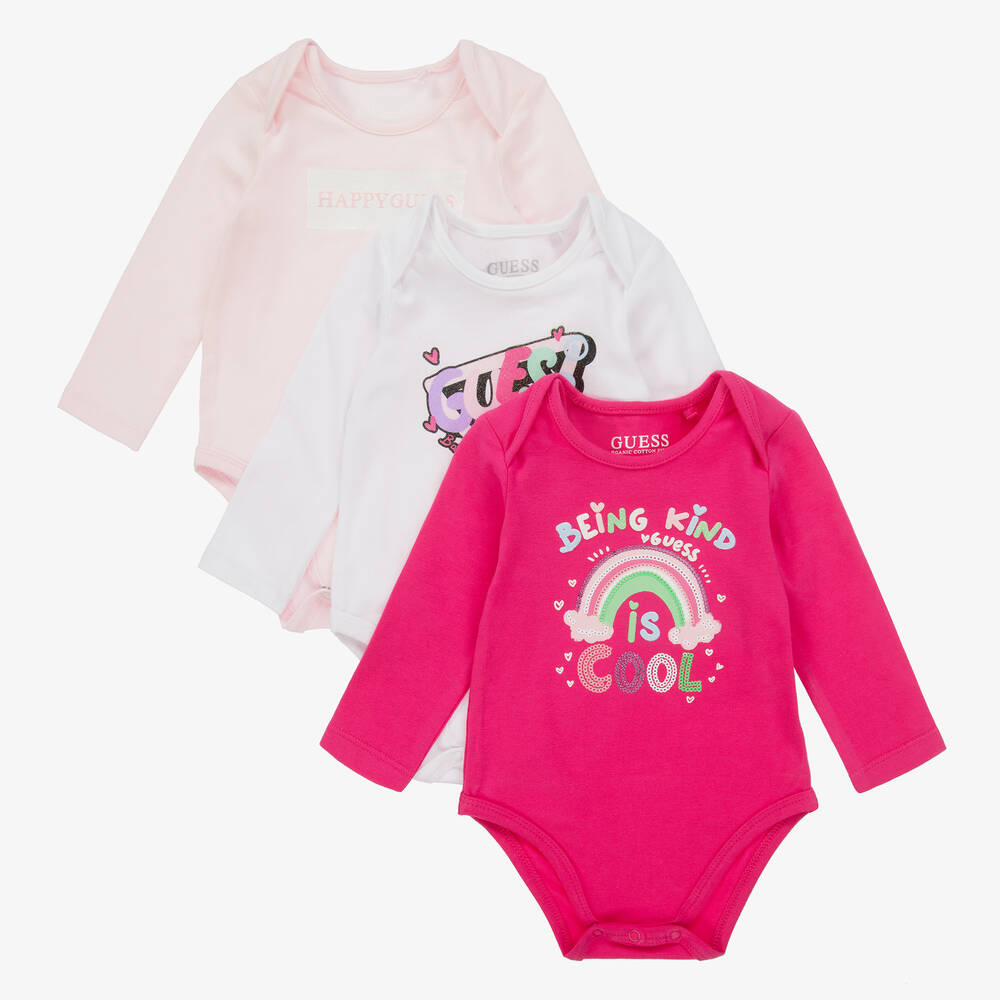 Pack of three bodyvests for baby girls by Guess, in lovely shades of pink. Made in soft organic cotton jersey, each vest has long sleeves, an envelope neckline and popper fastenings between the legs for quick and easy dressing. For designer appeal, they are patterned in fun, bright logo motifs, using a variety of colourful prints and sequins. These useful bodyvests come in a branded gift box.