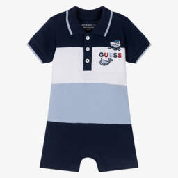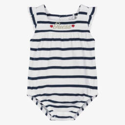 Pink jersey shortie for baby girls by Guess, patterned with little red cherries and 4g logos. Made with organic cotton, the short sleeves and popper fastenings provide ease of wear. A glittery pink Triangle logo is printed on the front for a branded look.
