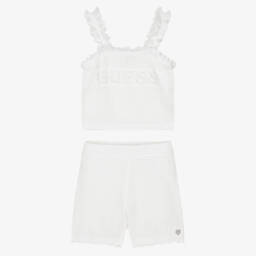 In white and pale blush pink, this cute shorts set for baby girls is designed by Guess. Made in soft cotton jersey, the T-shirt is printed with pretty butterfly and floral motifs, with shimmery gold accents. It has delicate ruffle sleeves and fastens with poppers on one shoulder to help with dressing. Completing the look, the comfortable shorts have little turned-up cuffs and a gently elasticated waistband.