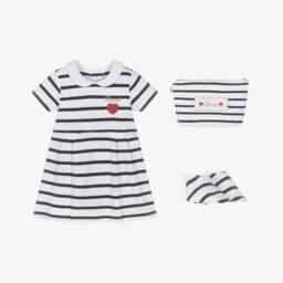 Lovely ivory bodysuit and red tweed dress set for baby girls by Guess. The long-sleeved bodysuit is made in soft and comfortable cotton jersey. Simply styled, it has a heart logo appliqué with sparkly sequins, and fastens with poppers on the back and between the legs. The pinafore dress is made in red and ivory tweed fabric with a subtle gold sparkle and has adjustable shoulder straps with gold-tone branded buttons. A gold-tone heart logo above the front hem adds a discreet branded touch.