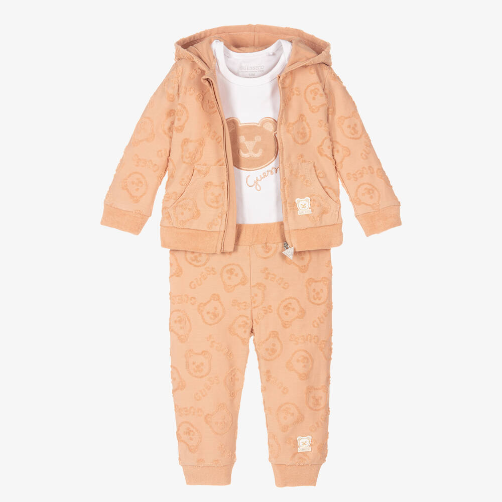 Baby boys beige three-piece tracksuit set from Guess, made in soft and stretchy organic cotton jersey. Patterned in bouclé logos and bears, the hooded zip-up top has a branded zip fastener and logo patch on the pouch pocket. The matching trousers have a comfortable elasticated waistband. To complete the set, it comes with a white bodyvest that has an envelope neckline, popper fastenings between the legs and an adorable teddy logo appliqué on the front. This lovely set comes in a branded gift box.