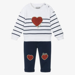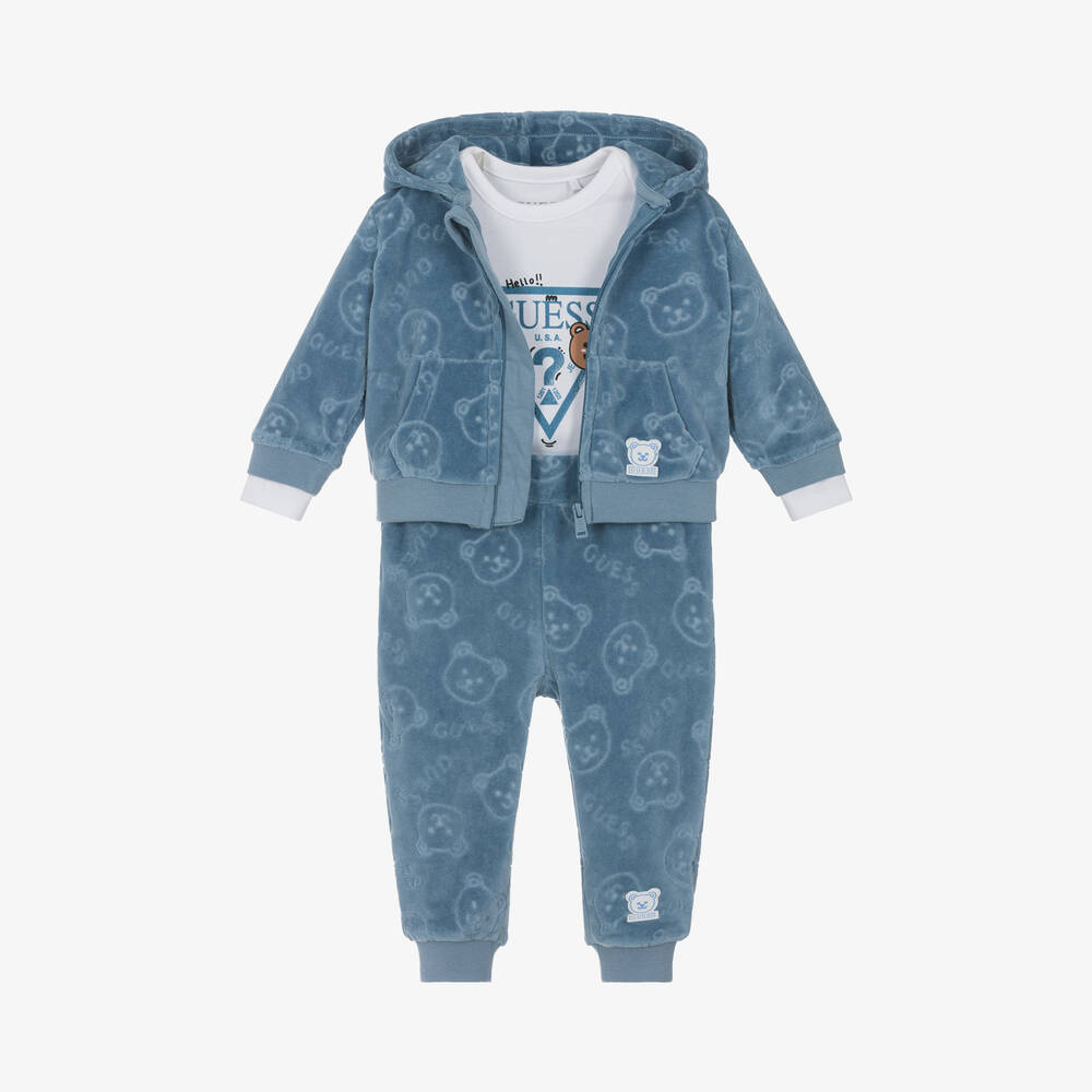 A pale blue velour tracksuit set for baby boys and girls from Guess, with cute teddy bear logos. The tracksuit fabric is embossed with teddy bears for a fun, coordinating finish. To complete the look, the soft jersey bodyvest has popper fastenings between the legs to keep it tucked in and the iconic Triangle logo for brand recognition. This item contains organic cotton fibres.