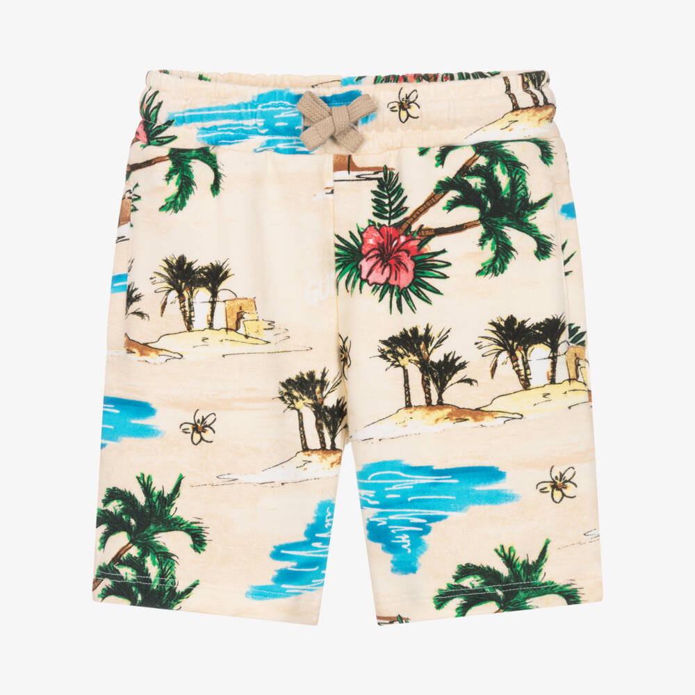 Boys beige cotton shorts, designed by American brand Guess. Made in a soft and comfortable jersey with a desert island inspired print. They have a gently elasticated waist with beige drawstrings for a great fit. There are handy front pockets and the back pocket has the designer's iconic logo embroidered in red.