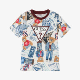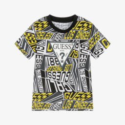 Casual black and grey T-shirt for younger boys by Guess, with a cool logo pattern and yellow accents. Made from soft cotton jersey, it features the label's distinctive Triangle logo print in grey and white for a signature finish.
