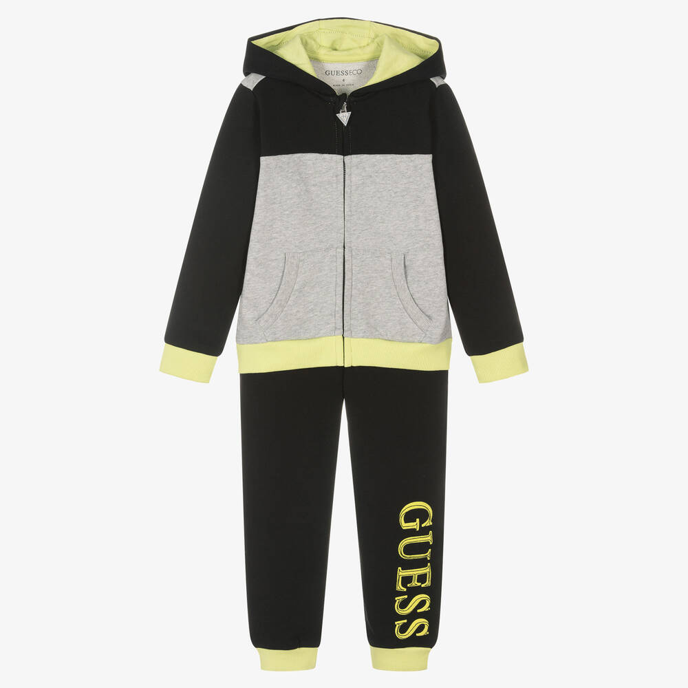 Two-tone black colour blocked tracksuit for younger boys from Guess. Made in mid-weight cotton-blend jersey, it is cool and casual with contrasting yellow ribbed trims for added comfort. The hooded top fastens with a branded zip on the front and has a yellow appliqué on the back. The pull-on joggers have a matching appliqué logo on one leg for a coordinated look. Contains in-conversion organic cotton fibres.