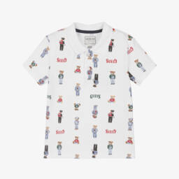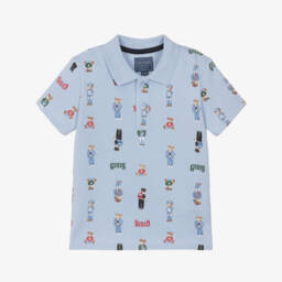 Pale blue polo shirt for younger boys by Guess, featuring a playful all-over pattern of bears and colourful logos. Casual and comfortable, it is made in soft cotton piqué, with a classic ribbed collar and button fastenings.