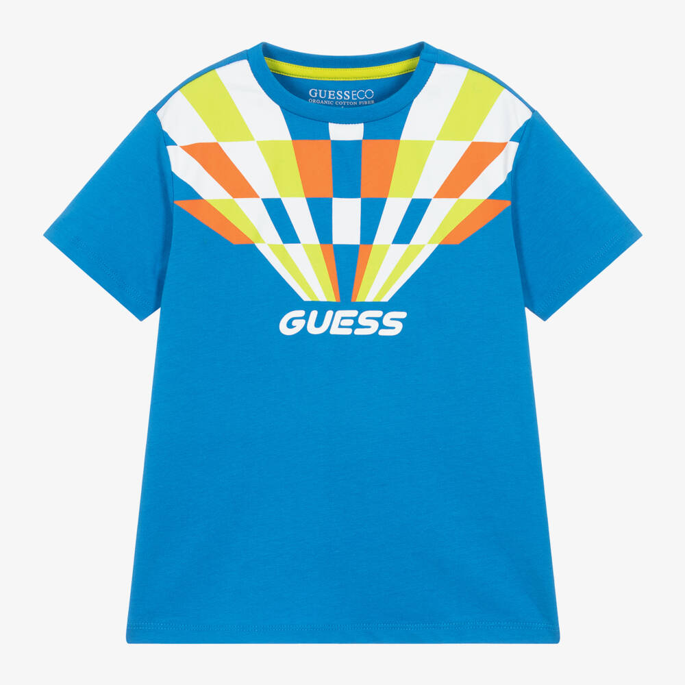 Cool and casual blue short-sleeved cotton T-shirt for boys from American label, Guess. It has a vibrant geometric graphic and a white logo printed on the front. This soft and stretchy crew neck tee contains organic cotton fibres.