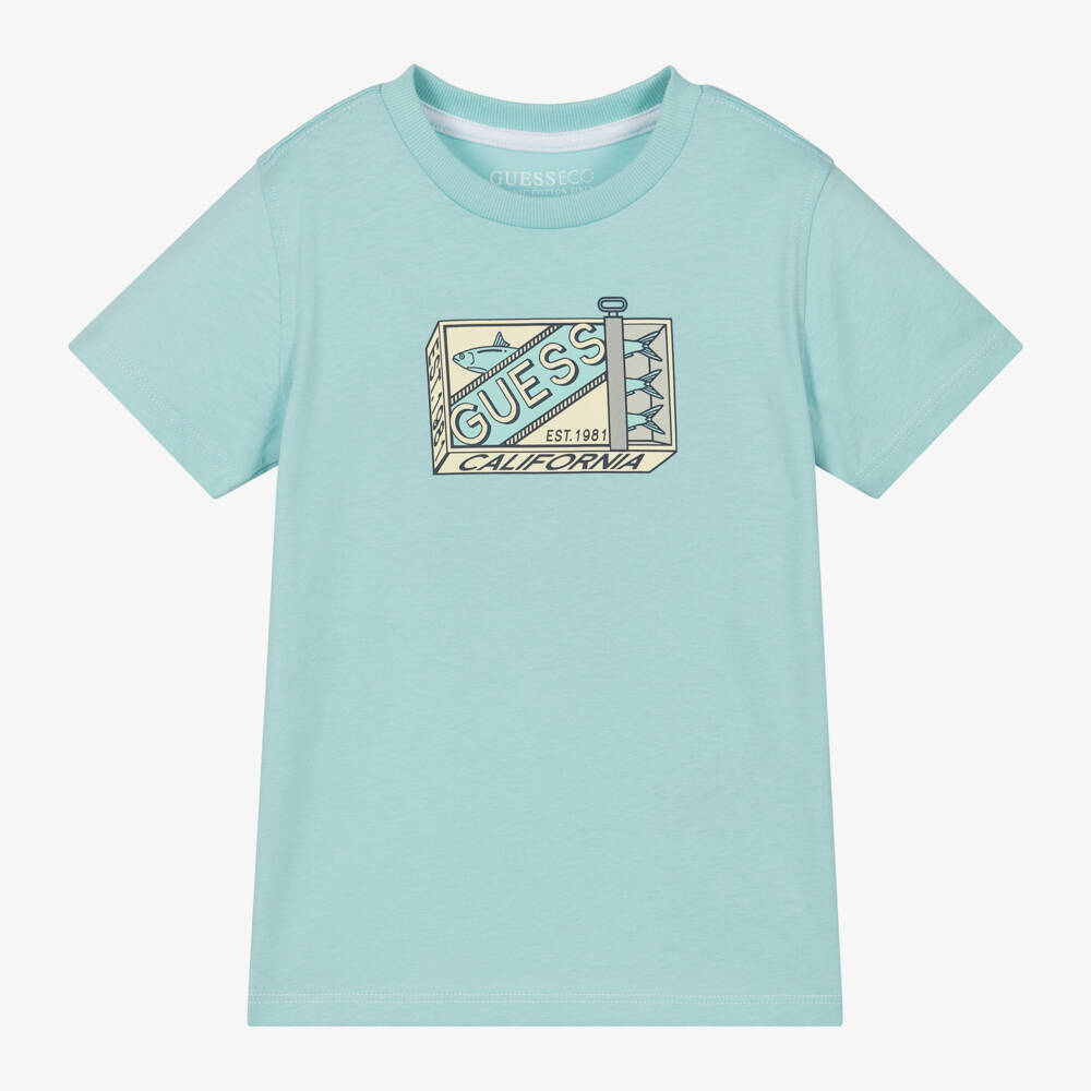 A light blue short-sleeved T-shirt for boys by Guess, made from soft cotton jersey. For a fun branded look, it is printed with a pale yellow and blue 'sardine tin' logo design on the chest and has tonal topstitching for a neat finish. This item contains organic cotton fibre.