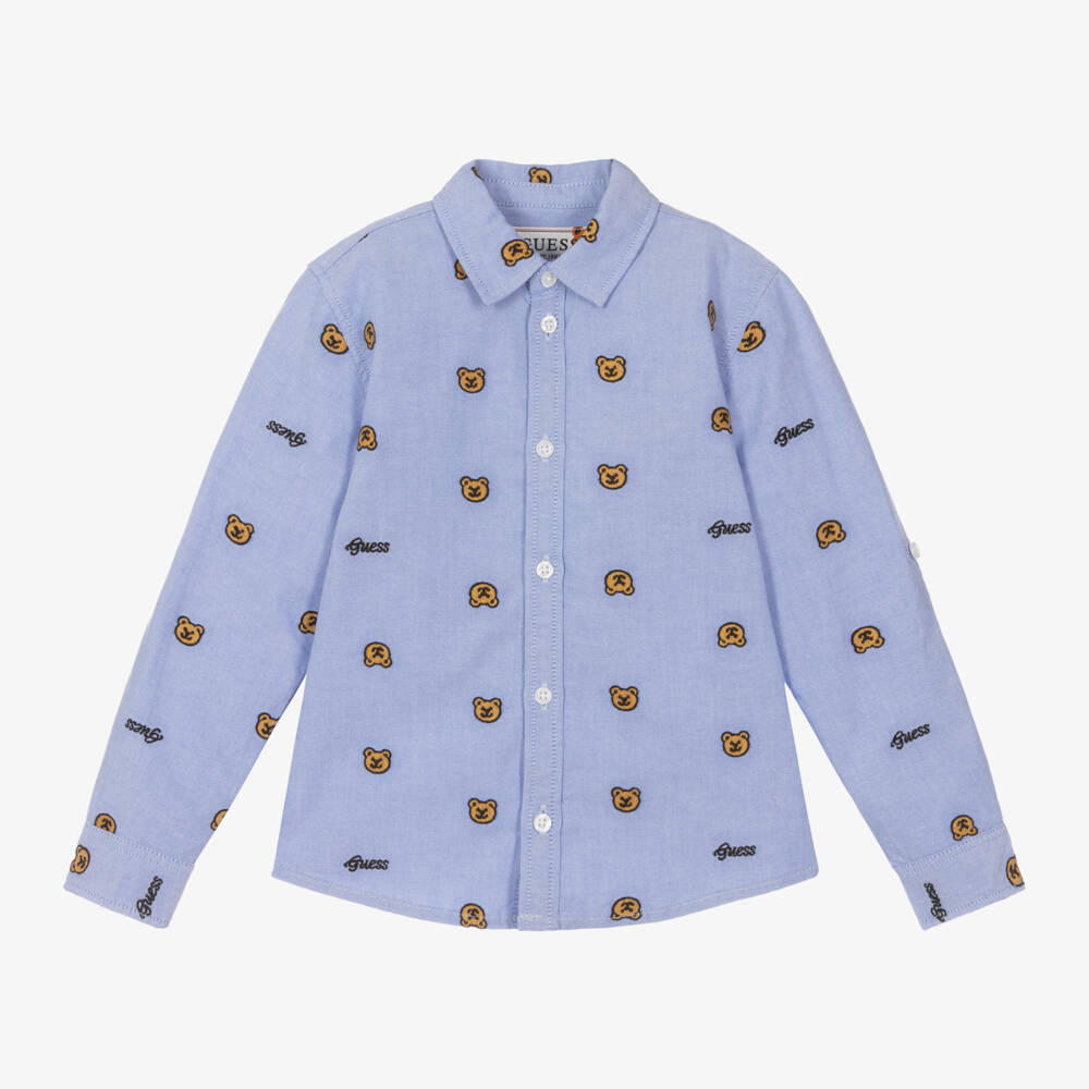 A blue long-sleeved shirt for younger boys by American brand Guess, woven in soft cotton. The designer's adorable teddy bear is appliquéd throughout, with black logo embroidery adding that signature touch. Classically styled with a pointed collar, it fastens with branded buttons and has adjustable length sleeves that secure with button tabs.