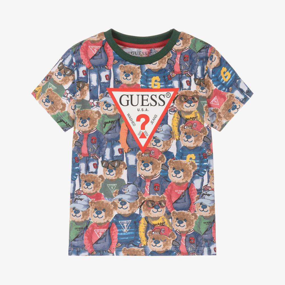 Blue cotton T-shirt for younger boys by Guess, patterned with colourful, branded teddy bears for a fun and playful look. Made in soft jersey, this casual tee has the distinctive Triangle logo printed in red and white on the front.