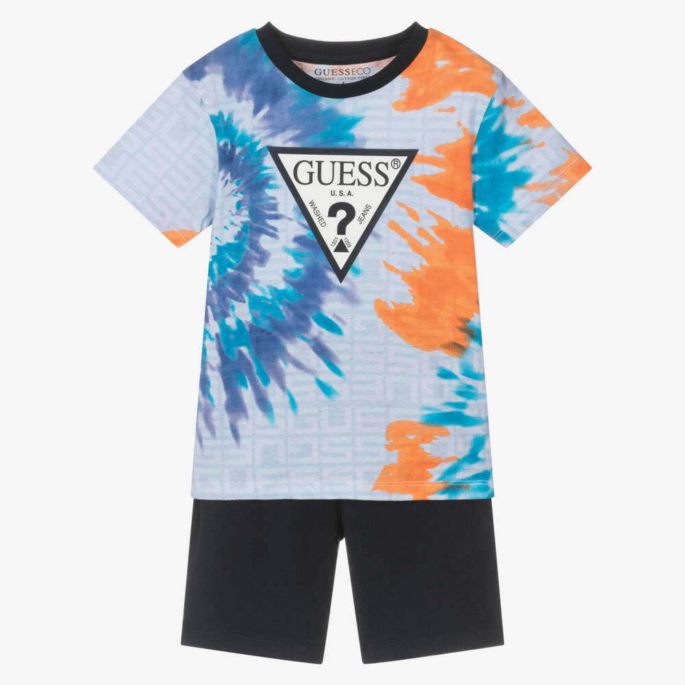 Featuring a cool tie-dye effect in vibrant shades of blue and orange, this casual shorts set for younger boys is by Guess. The T-shirt displays the designer's signature Triangle logo on the front, and the navy blue shorts have an elasticated drawstring waist, with a smaller logo on the back.