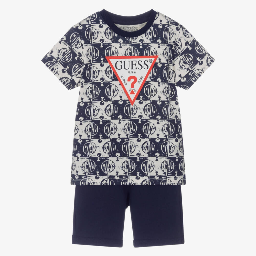 Younger boys navy blue cotton shorts set, unmistakably by Guess. Endlessly comfortable in soft jersey, the T-shirt has a circular logo print, with a rubberised red Triangle logo on the front. Complementing the top, the coordinating navy blue shorts are made in soft sweatshirt jersey with fixed turn-ups. They have an elasticated waistband that fastens with a popper, and four useful pockets, one with a further Triangle logo.