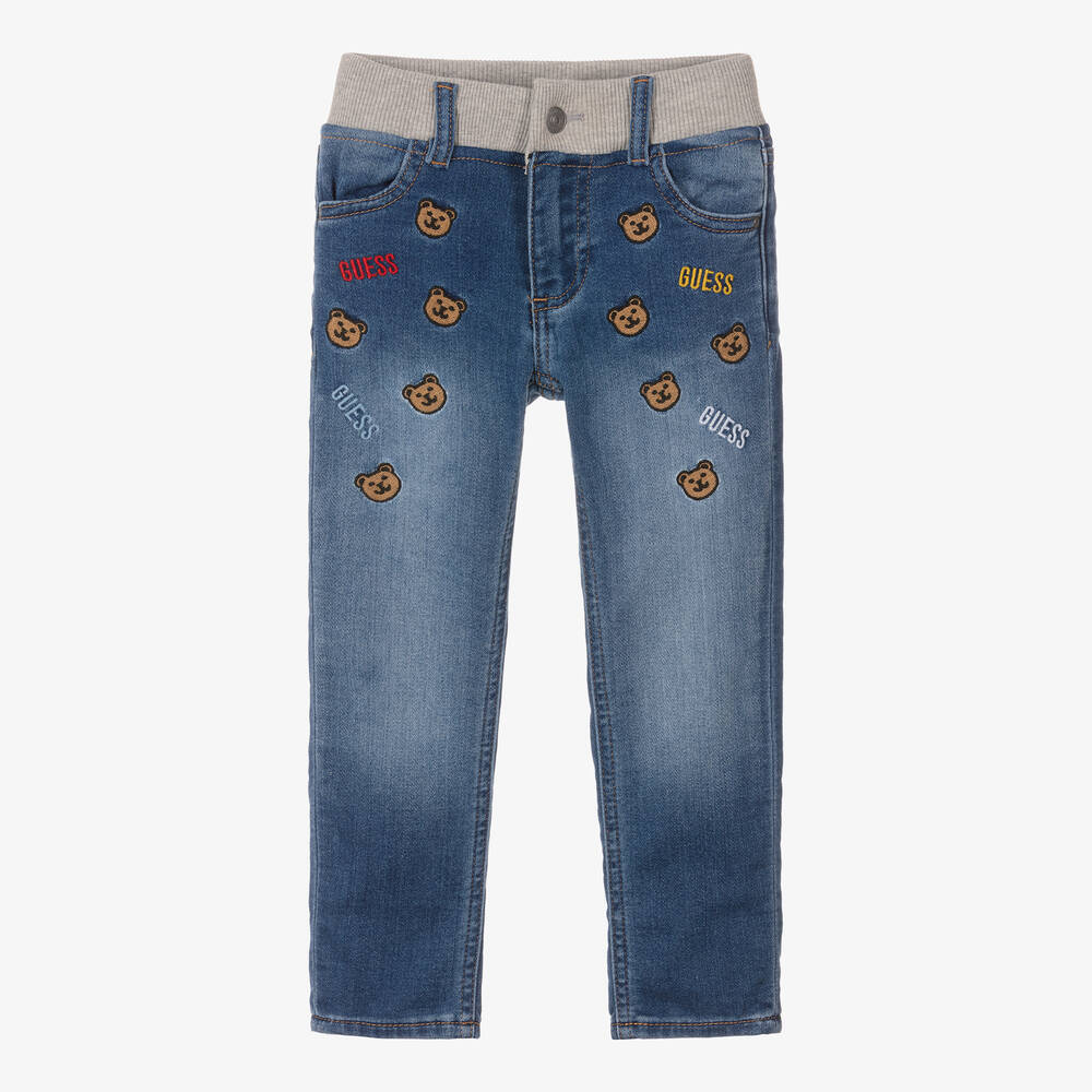 Mid-blue jeans for little boys by Guess, made in comfortable cotton-blend jersey denim. Garment treated for a cool, vintage look, they are embroidered on the front with Guess logos and teddy bears in red, blue and beige, with the signature Triangle logo patch on the back pocket. Fastening with a zip and branded popper, they have a stretchy, grey ribbed waistband for added comfort. Pockets on the front and back complete the style.