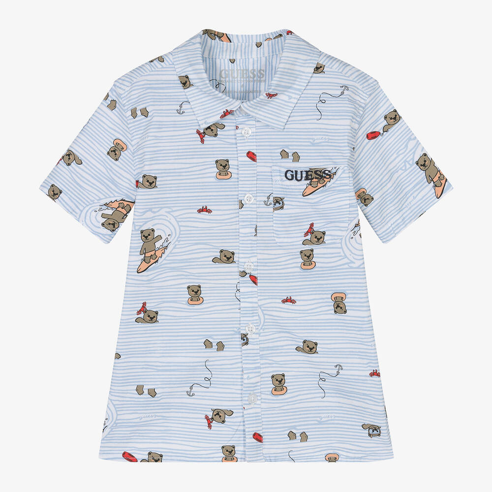 A blue and white short-sleeved shirt for younger boys by Guess, made in stretchy and lightweight cotton. With a fun ocean theme, this cool shirt is patterned with adorable teddy bears surfing and swimming in the sea. The chest patch pocket is embroidered with the designer's logo in navy blue and it fastens neatly with branded buttons. This item contains organic cotton fibres.
