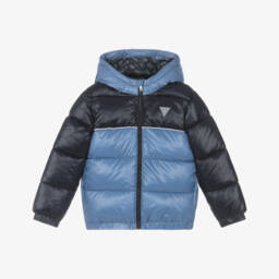Blue hooded puffer jacket by Guess, offering warmth and style for younger boys. Silky smooth and softly padded, the two-tone design features a logo-printed lining and a Triangle logo patch on the chest. It fastens with a zip and has practical side seam pockets and an internal slip pocket.