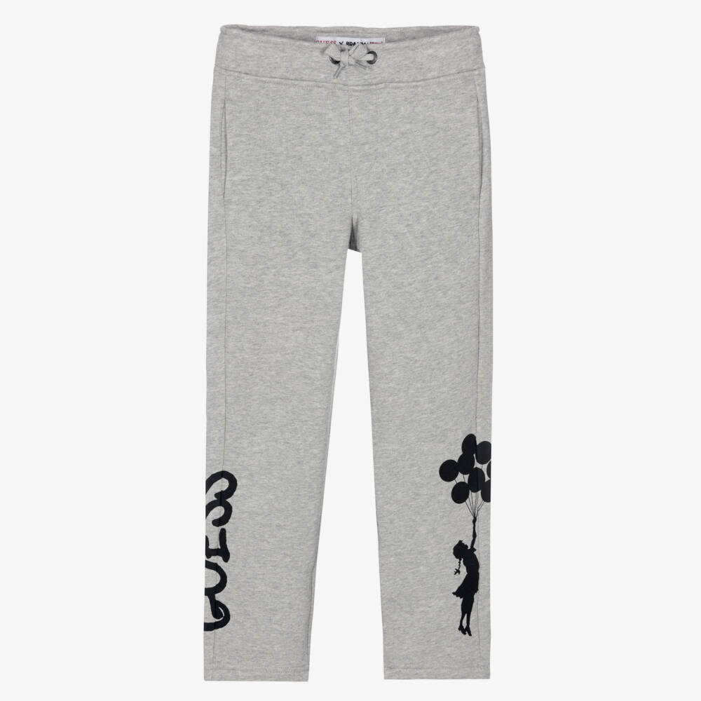 Grey marl joggers for boys from Guess. Forming part of the designer's Brandalised capsule, these cool trousers have iconic artwork from graffiti artist Banksy on one leg. The label's streetwear-style logo is printed on the other leg. Containing organic cotton fibres, they are made in soft, stretchy and comfortable cotton-mix jersey. They have useful side pockets and an elasticated, drawstring waist to ensure quick and easy dressing.
