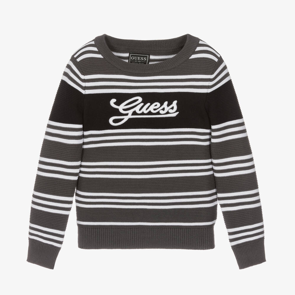 Grey and white striped sweater for younger boys by American brand Guess, with the designer's name embroidered on the front. Casual and comfortable, it is knitted in a soft cotton blend, with a crew neckline and cosy ribbed trims.