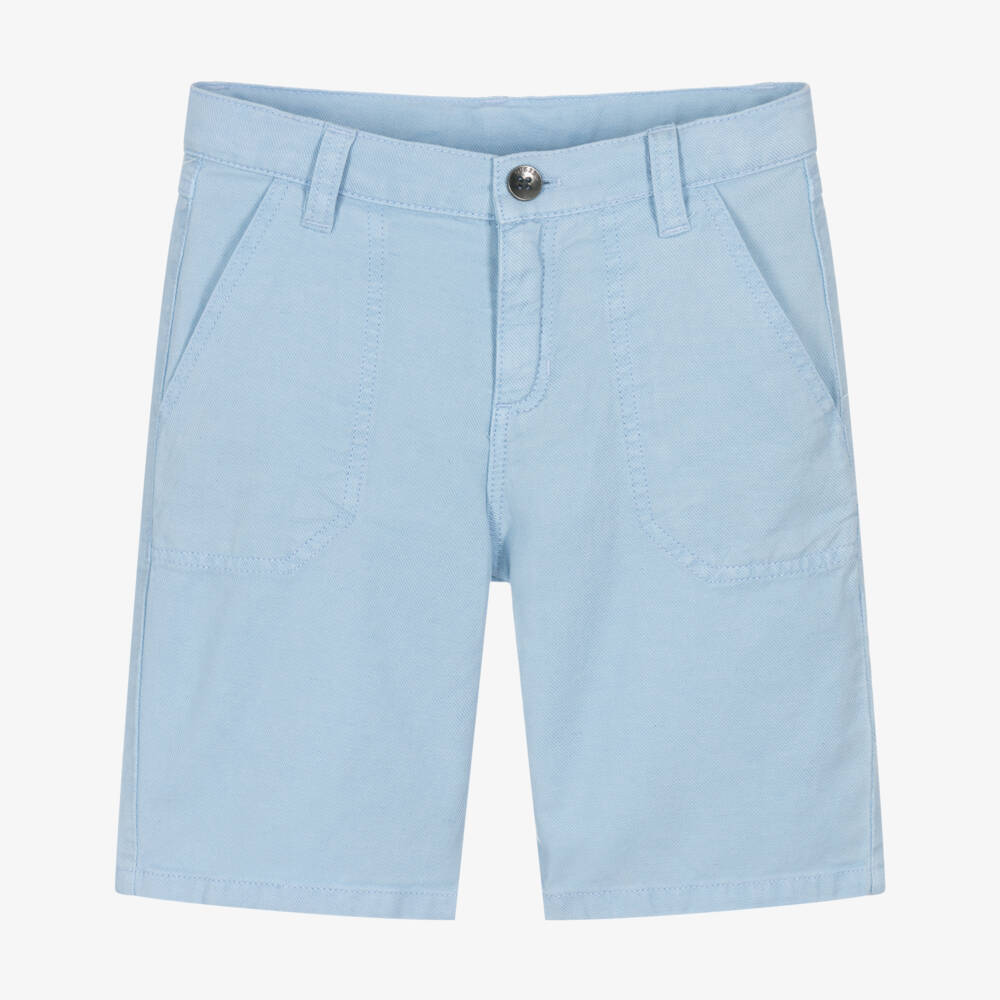 Boys light blue shorts by Guess, made in a blend of lyocell, cotton, and linen for a soft and breathable feel. These lightweight shorts, ideal for warm weather, have an adjustable waistband for a comfortable fit. With front and back pockets, they provide practicality with a touch of classic design.