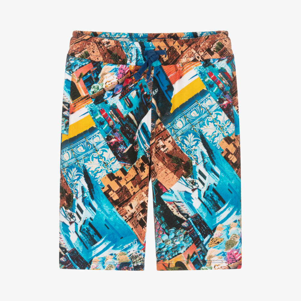 Boys colourful Marrakech print shorts by Guess. Made in mid-weight cotton sweatshirt jersey, they are Bermuda-length and have an adjustable drawstring waist. There are side seam pockets and one on the back with a logo patch.
