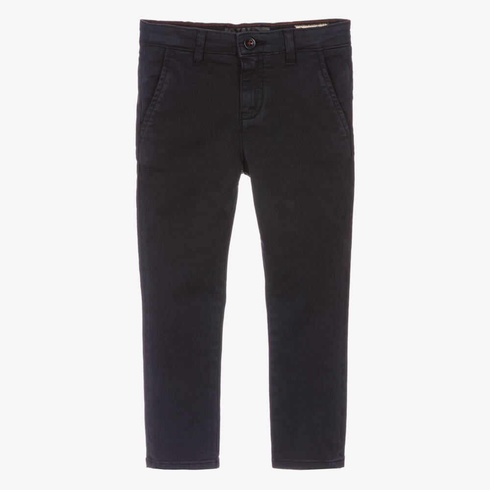 Navy blue chino trousers for boys by Guess, made from soft and stretchy cotton twill. Great for smart or casual wear, they have a four-pocket design with a signature metal logo badge on the back. Fastening with a button and zip, the adjustable waistband creates the best fit.