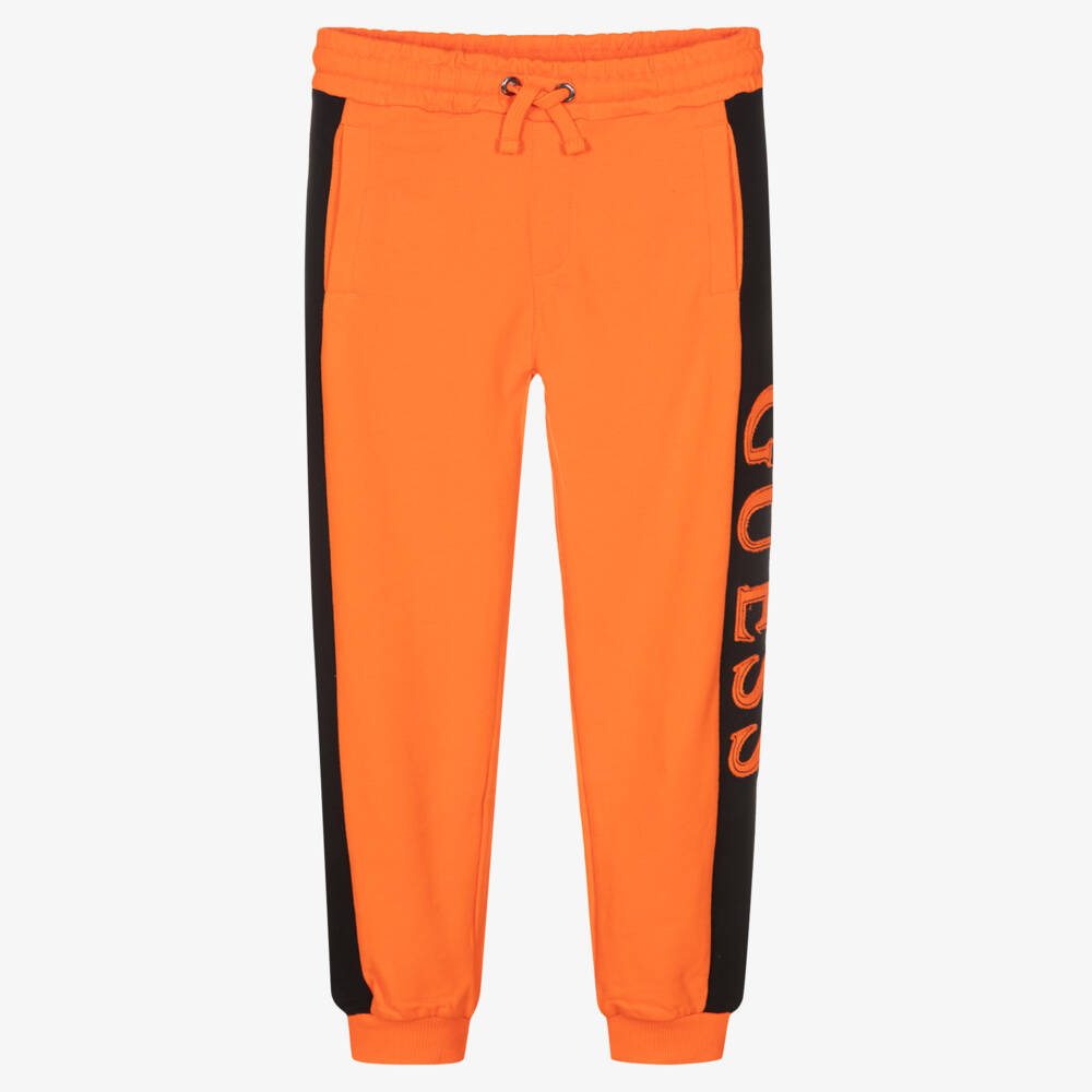 Stylish and casual, bright orange joggers for boys by American brand Guess, with black panels on the sides. A large orange logo appliqué with raw edges can be seen on one leg for a bold branding vibe. There are two front pockets and a small pocket with invisible zip on the back. They are made from soft cotton sweatshirt jersey with ribbed ankle cuffs and an adjustable drawstring on the elasticated waist.