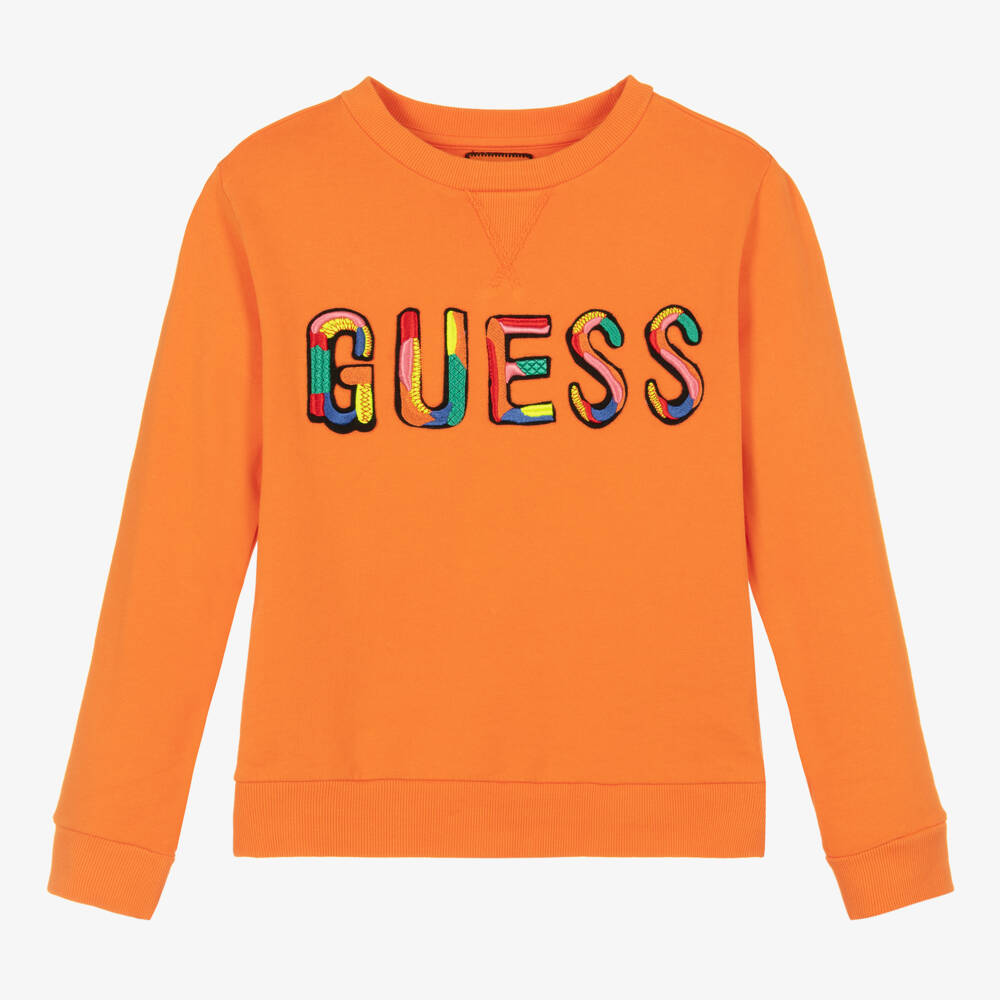 Older boys orange crew neck sweatshirt by Guess, made in soft cotton jersey. In a slouchy, relaxed fit, this easy-to-wear style has a colourful logo appliqué on the front for an instantly recognisable, branded look.