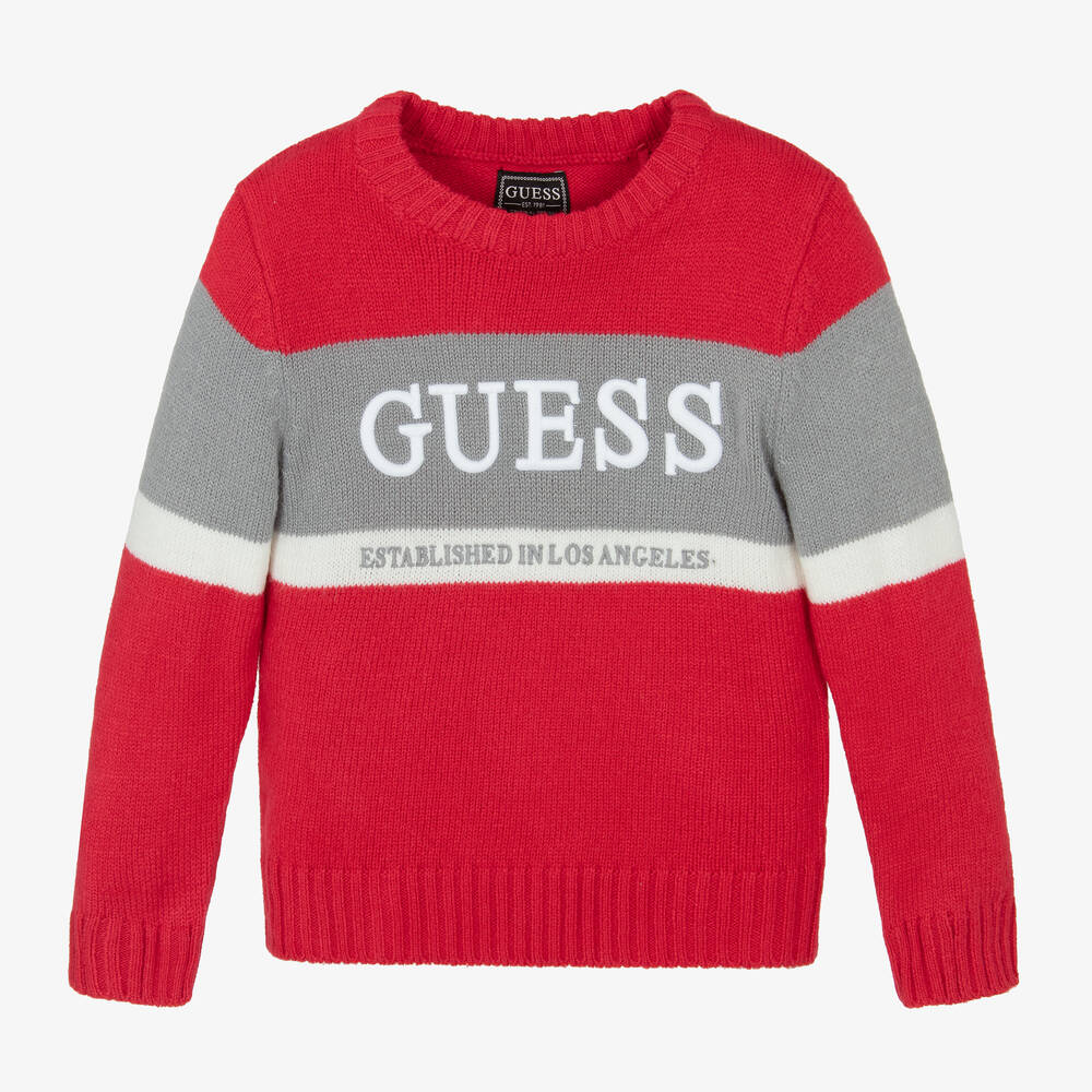 For younger boys, a red knitted jumper from Guess. This casual and comfortable jumper is ideal for layering and has ribbed trims to keep the warmth in. Stripes of grey and white across the front have the brand name and established data in contrasting colours for a designer finish.