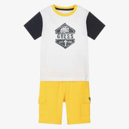 Casual jersey shorts set for younger boys by Guess, made with organic cotton. The set includes a white and navy blue T-shirt with a bold circular logo design on the chest, paired with vibrant blue shorts. The cargo-style shorts have practical side pockets, an adjustable waist for ease of wear, and a logo on the back to complete the look.