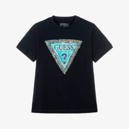 White cotton T-shirt for older boys by Guess, featuring the brand's iconic Triangle logo, in vibrant shades of yellow and blue. Casual and comfortable, it is made in soft jersey with a classic crew neckline.