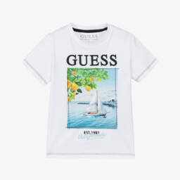 White cotton T-shirt for boys by Guess, made in soft comfortable jersey. This casual tee has a bold blue print on the front with embroidered detailing, including a sail boat, lemons and the brand's logo. Contrast navy blue overstitching on the sleeves and hem add a stylish finishing touch.