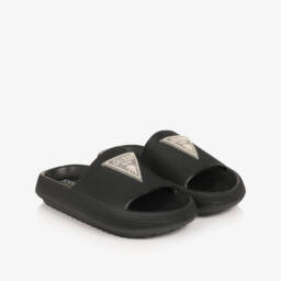 Black sliders for boys and girls by Guess, featuring a white Triangle logo patch on the straps. Lightweight and comfortable, they are made with a moulded footbed and a chunky, deep-threaded sole, ideal for the beach, poolside and beyond.