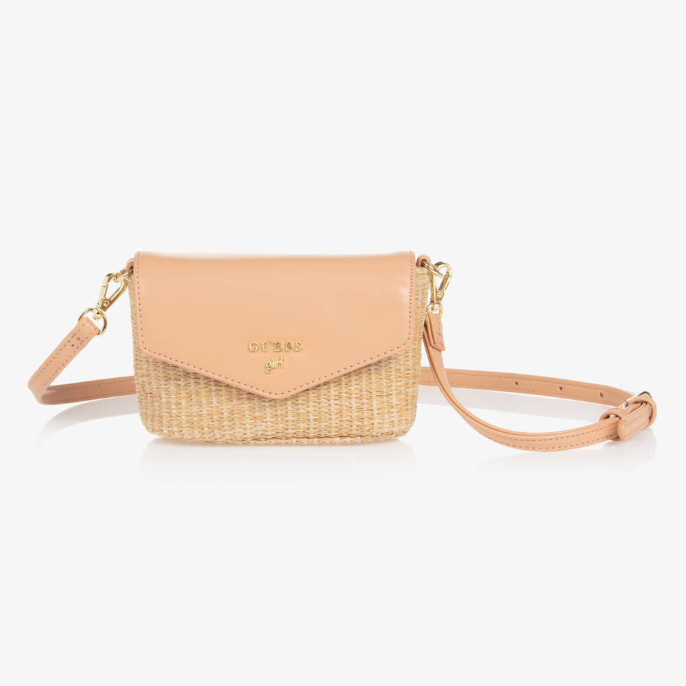 A chic beige-pink bag for girls by Guess made with faux leather and a woven faux straw exterior. With gold-coloured hardware, this stylish piece has a gold logo plate on the front flap for instant recognition. Fastening with a magnetic popper closure, this compact design comes with a detachable shoulder strap that can be easily adjusted for comfortable wear.
