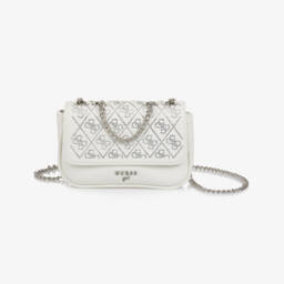 Stylish beige tote bag for older girls by Guess, with a gold logo on the front. It has eye-catching logos on the woven carry handles and a detachable pink cherry charm. A great warm weather look, it is woven in sturdy, faux raffia with a round faux leather trim on the base and branded twill lining. The roomy compartment has a zipped pocket and fastens with a magnetic popper tab.