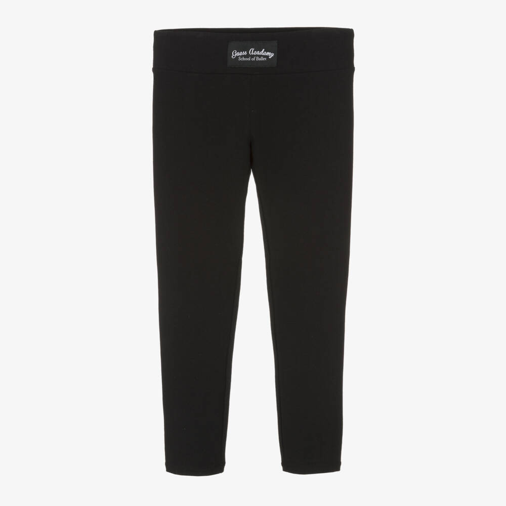 Black leggings for girls by American brand Guess, made from a soft and stretchy cotton blend. From the brand's ballet capsule, these full-length leggings have a distinct logo patch sewn on the front of the elasticated waist. This item is made with recycled materials.