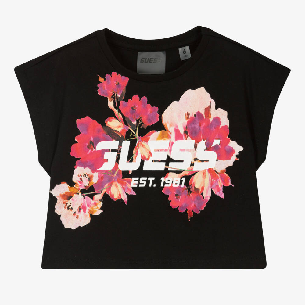 A pretty black T-shirt for girls by American brand Guess, made in soft cotton jersey. In a cool boxy fit with capped sleeves, this top has a sleek white logo and a pretty pink floral print.