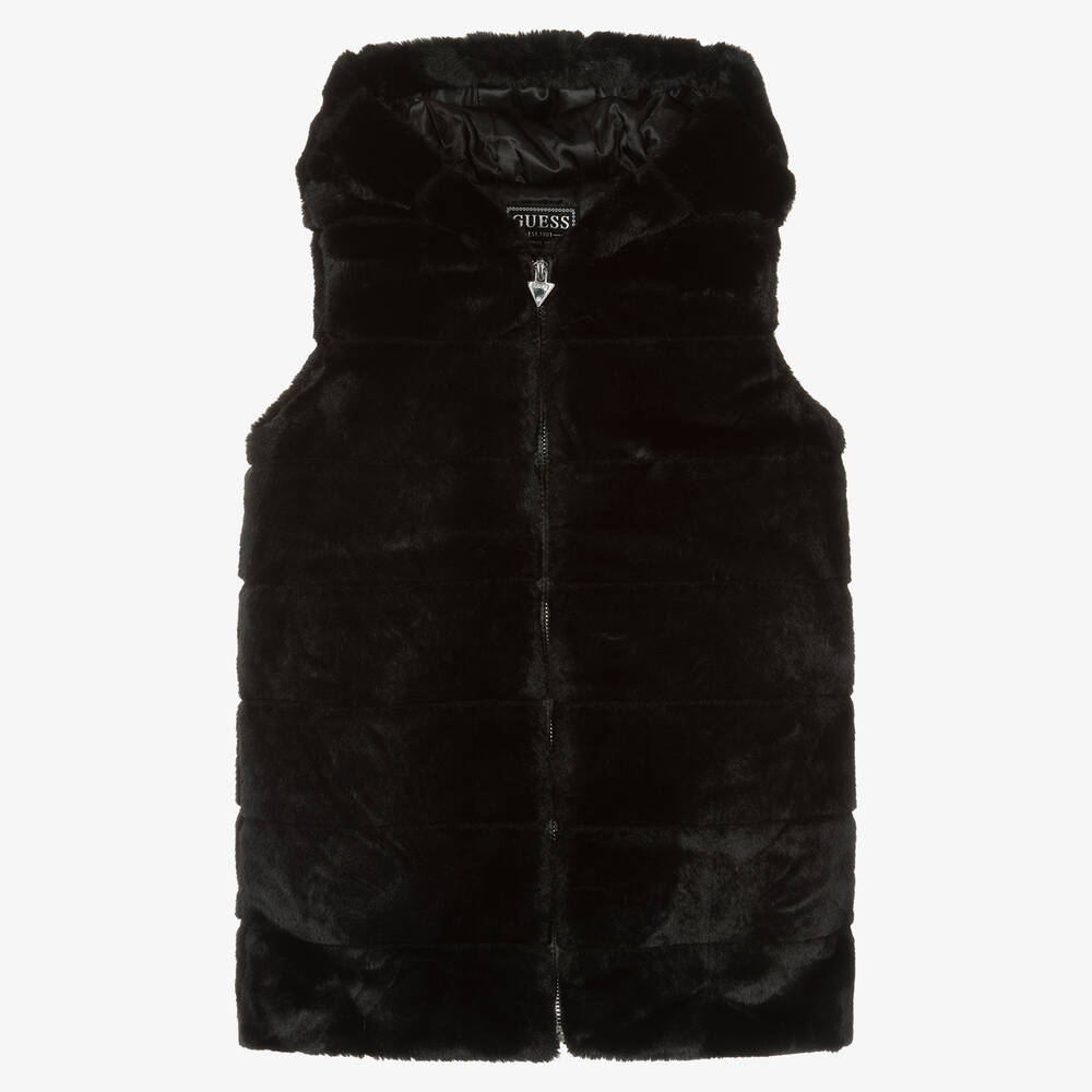 Glamorous black gilet for girls by American brand Guess, lined for comfort. Made in beautifully soft plush faux fur with a ridged effect, the back of the long-line silhouette has a white logo detail at the hem. It fastens smoothly with a shiny silver zip, embossed with the brand's Triangle logo for a branded finish.