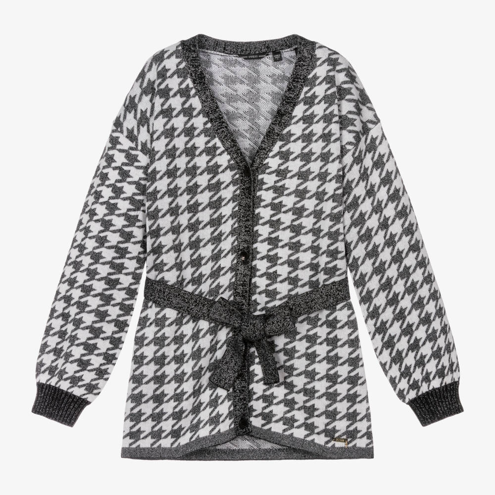 Stylish black and white houndstooth cardigan for girls by Guess, knitted in a soft wool blend. Oversized yet chic, it has a shimmering thread throughout for a glamorous look. It fastens with black buttons on the front, and has a tie belt fastening around the waist for a feminine finish. It has a shiny gold logo badge near the hem for a discreet, branded finish.
