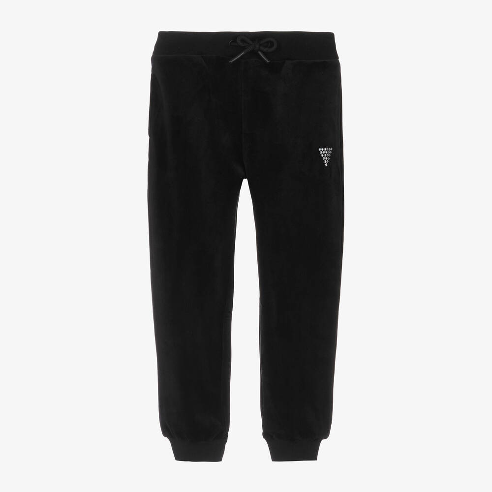 Stylish yet casual, black velour joggers for girls by Guess, as seen in their main collection. These cool and comfortable leisure wear trousers feel luxuriously soft and have a drawstring waist and cuffed ankles. There are practical side seam pockets and the brand's diamanté triangle logo adds a sparkly touch on the front.