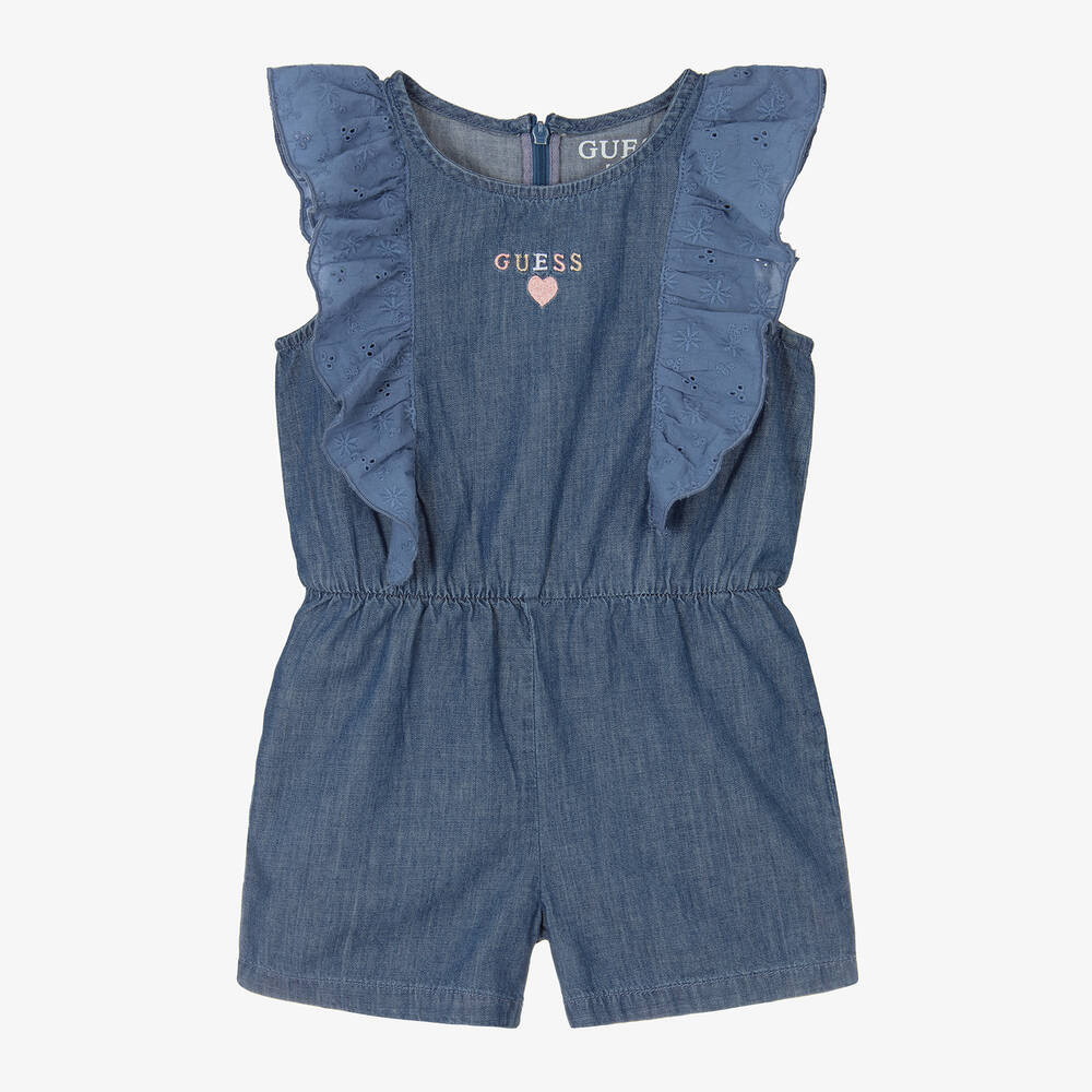 A lovely blue chambray playsuit for younger girls by American brand Guess, with pretty broderie anglaise ruffle trims. It has an elasticated waist for comfort and fastens easily with a zip down the back. Adding a designer touch, there is an embroidered logo on the front, in pink and sparkly gold.