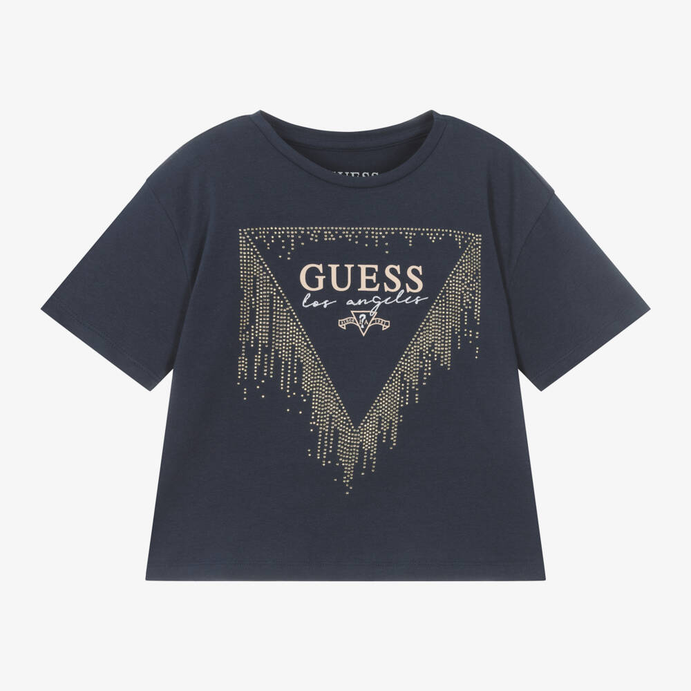 A cool blue short-sleeved T-shirt for girls by Guess, made from soft and stretchy jersey. In a casual boxy style, it has a pale gold and beige logo design in the iconic triangle shape, with embroidered and diamanté detailing for added sparkle. This item contains organic cotton fibres.