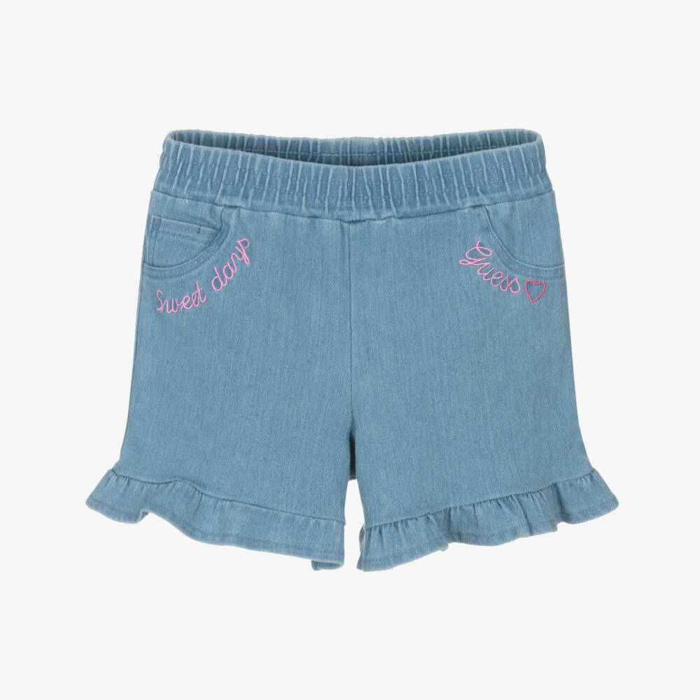 Younger girls casual blue denim shorts by Guess, capturing the playful spirit of warm weather fashion. They have 'Sweet Days' embroidered in pink on one side, and a script logo with a heart on the other. Made in a comfortable, soft cotton blend they have charming frill detailing on the cuffs and the designer's signature Triangle logo on one of the back pockets in pink. Easy to wear, they simply pull up.