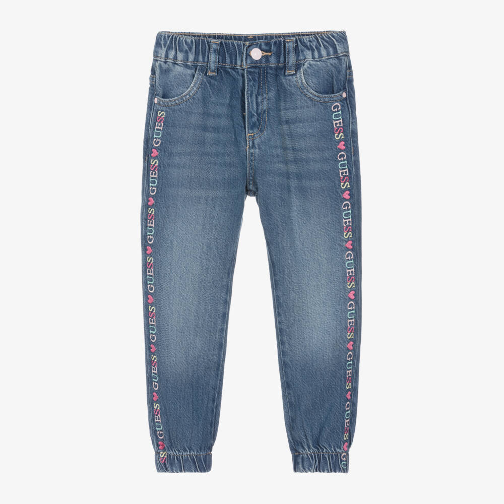 Blue mid-wash jeans for girls by Guess, made from soft denim. This cool jogger style has a comfortable elasticated waistband and ankle cuffs. In an array of pretty pastel shades, they are embroidered with logos and heart motifs down each side with matching detailing on one back patch pocket. Complete with pale pink branded rivets, they fasten with a coordinating zip and popper and have curved front pockets.
