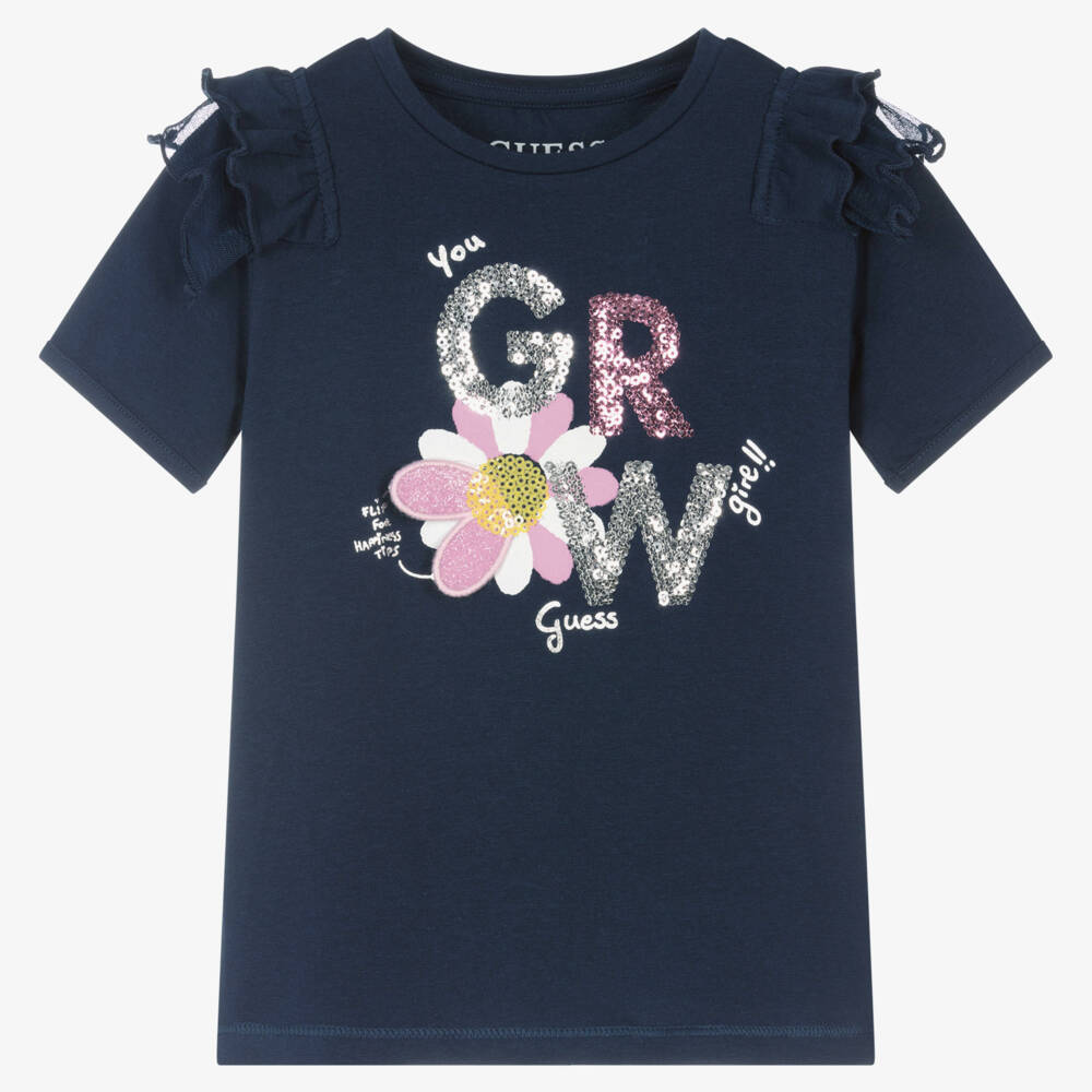 Navy blue T-shirt for girls by American brand Guess, made in soft and breathable organic cotton jersey. With a pretty 'You Grow Girl' slogan patterned in sequins and a flower print with fold-over petals that reveal positive affirmations. It has ruffle-trimmed sleeves with a tulle attachment.