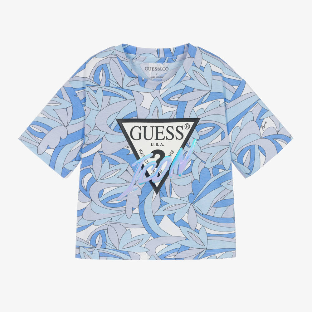Blue short-sleeved T-shirt for girls by Guess, made in soft cotton jersey. The designer's iconic Triangle logo is printed on the front of this abstract tee, with a cool, iridescent 'Icon' script layered over the top for an edgy twist.