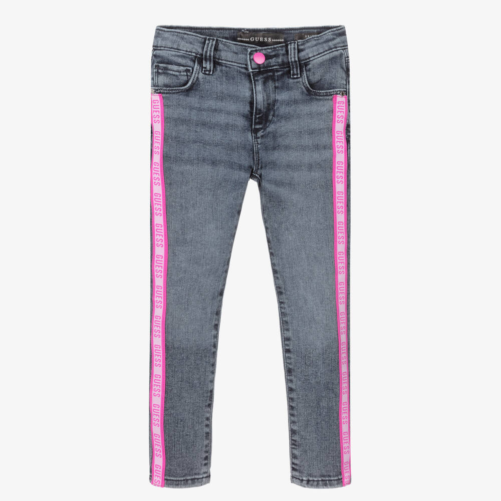Blue acid wash skinny fit jeans for girls by Guess, made in mid-weight cotton denim. In a classic five pocket style, they have bold pink logo tape on each leg and a matching pink Triangle logo badge on the back. Fastening with a zip and popper, they have a useful adjustable waist.