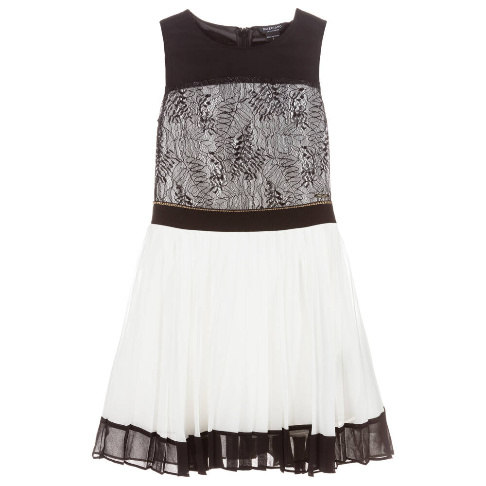 Gorgeous black and white dress by Guess Marciano. It has a pleated chiffon skirt and a lace bodice, with a fine gold chain around the waist. Fully lined in silky smooth satin, it fastens with a concealed zip on the back.