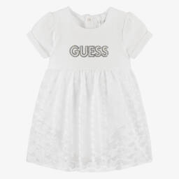 Girls will dazzle in this gold tulle special occasion dress by Guess, shimmering in sequins and embellished with pearl beads. It has long, sheer sleeves and shiny beige satin trims, with a matching, detachable sash belt, that ties in a large bow. Lined in lightweight twill with a fine mesh underskirt, it fastens with a discreet, concealed zip on the back.