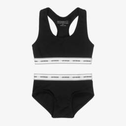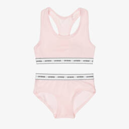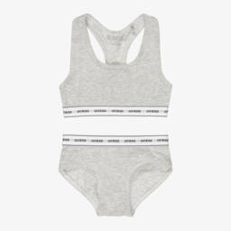 Girls grey marl organic cotton-blend underwear set by Guess, including a racerback bralette and matching briefs. Made in a soft comfortable jersey, both pieces have branded, white, elasticated trims for a comfortable fit.