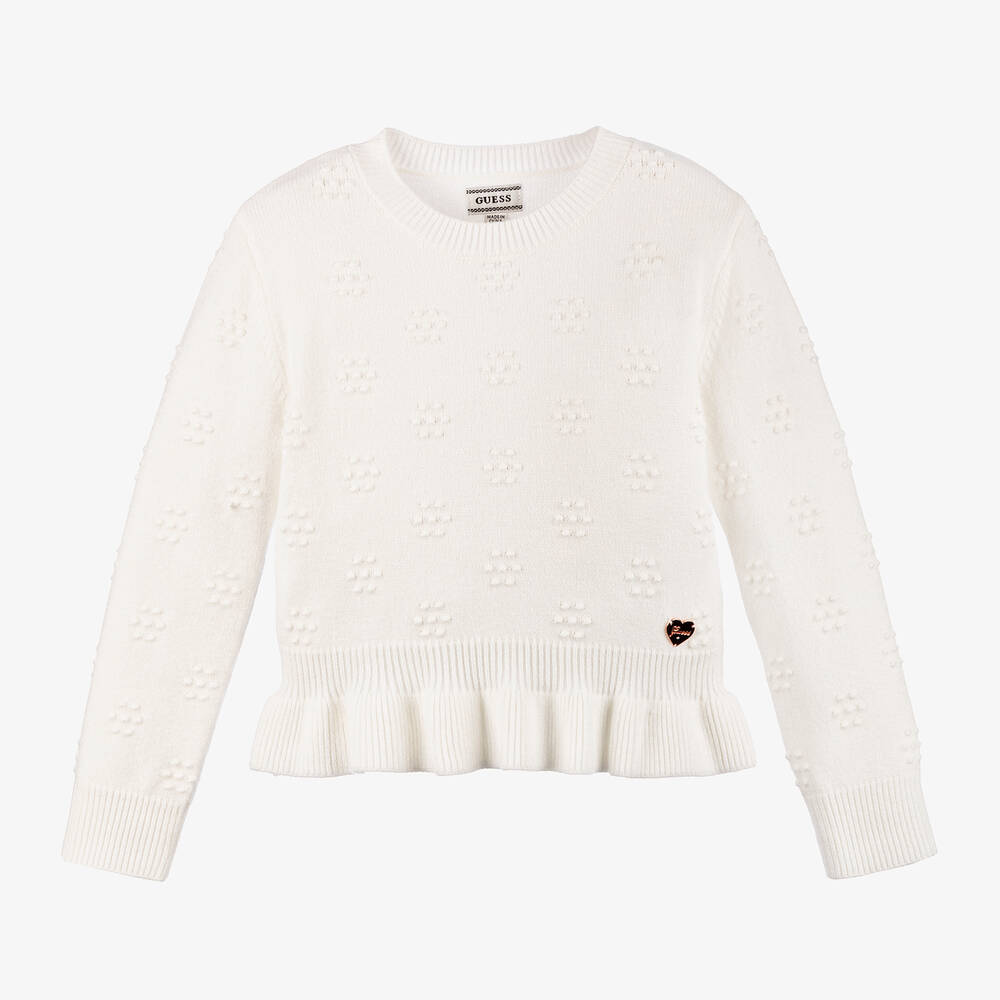 Lovely ivory sweater for younger girls by Guess, knitted in a soft viscose blend. Ideal as a warm layer on colder days, this crew neck top has an embroidered floral design and a cute peplum hem. A rose gold heart logo charm signs off the look.