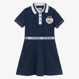 Navy blue polo dress for girls by Guess, with a cute teddy bear badge and gold logo embroidery on the chest. Made in soft, comfortable cotton piqué, this casual style has white tipping on the ribbed trims and a branded elasticated waistband for a signature finish. The skirt is flared, giving a fun, flippy silhouette.